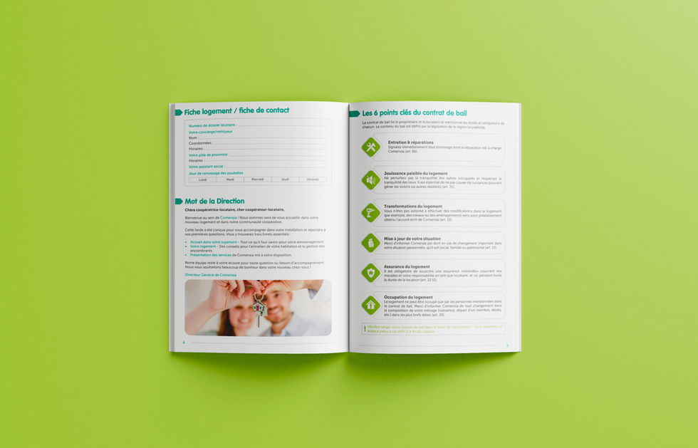 Des brochures fonctionnelles, engageantes et cohérentes avec l’image de Comensia, prêtes à accompagner chaque nouvel occupant dès son arrivée.